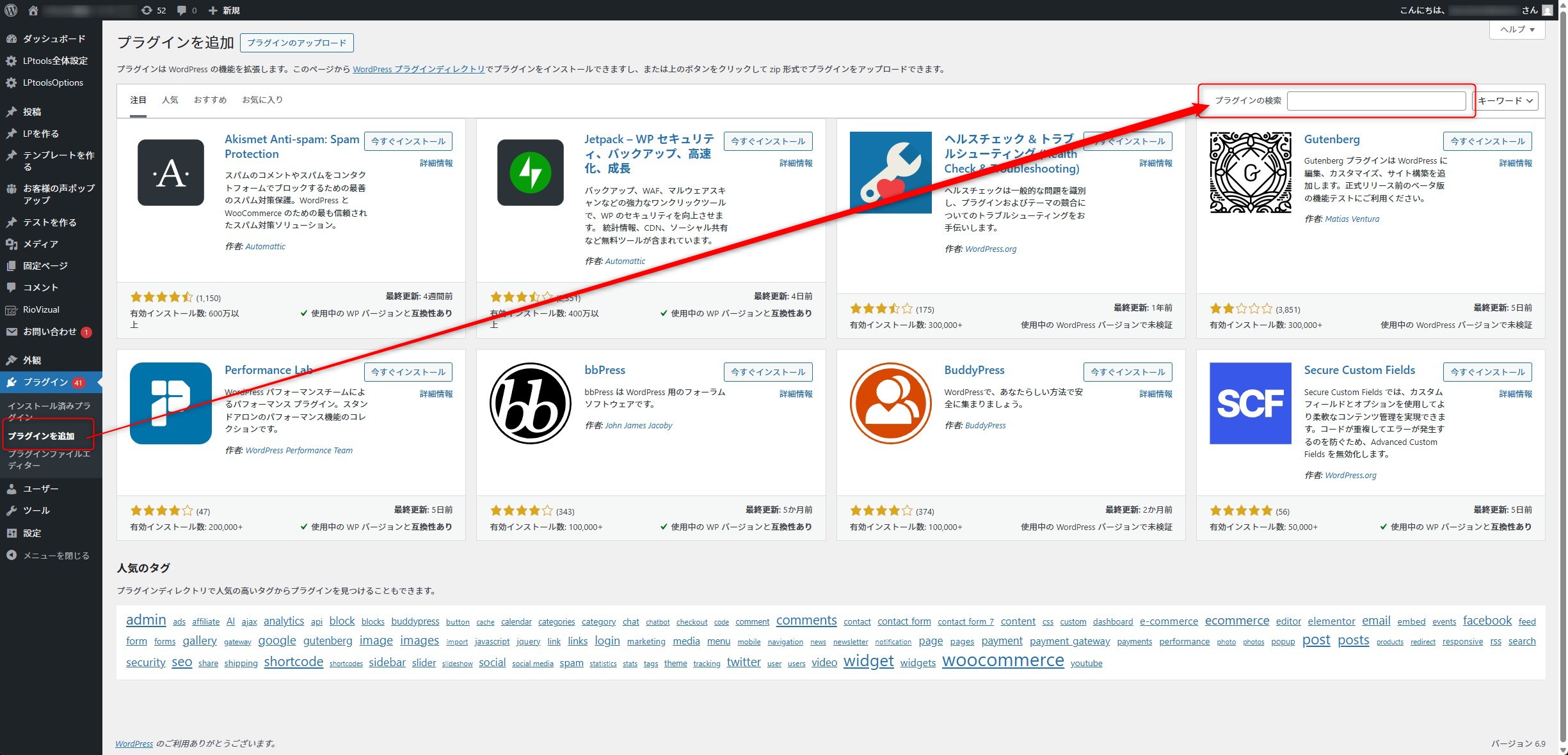 プラグインの新規追加ページへ移動し、